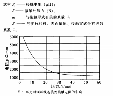 由公式(2)可知,影響母線槽搭接面觸摸電阻的主要因素有外表的條件K、m和所施加的壓力F。當母線槽外表處理和觸摸面積確定了,則Kj、m也確定了,于是觸摸電阻Rj與壓力F成為反比關系,壓力F越大,觸摸電阻Rj越小。圖5是壓力對兩片銅導體銜接處觸摸電阻的影響曲線圖。