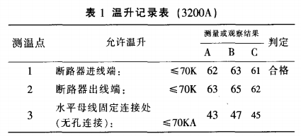 表2是溫升試驗室的質(zhì)檢人員按照國家標準GB7251.1-1997的有關條款對該樣柜進行溫升試驗,對整個母線槽體系的關鍵處和搭接面進行測量(測得部分溫升記載)