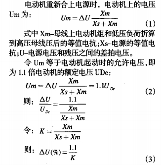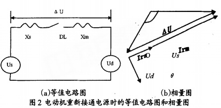 圖1所示為母線槽體系的某一段接線圖,圖2為電動(dòng)機(jī)切換時(shí)的等值電路圖。圖中Us-電源電壓;Ud-母線槽上電動(dòng)機(jī)的殘壓;Xs-電源等值電抗;Xm-母線槽上電動(dòng)機(jī)組和低壓負(fù)載的等值電抗(折算到高壓母線槽壓);AU-電源電壓與殘壓之間的差拍電壓。